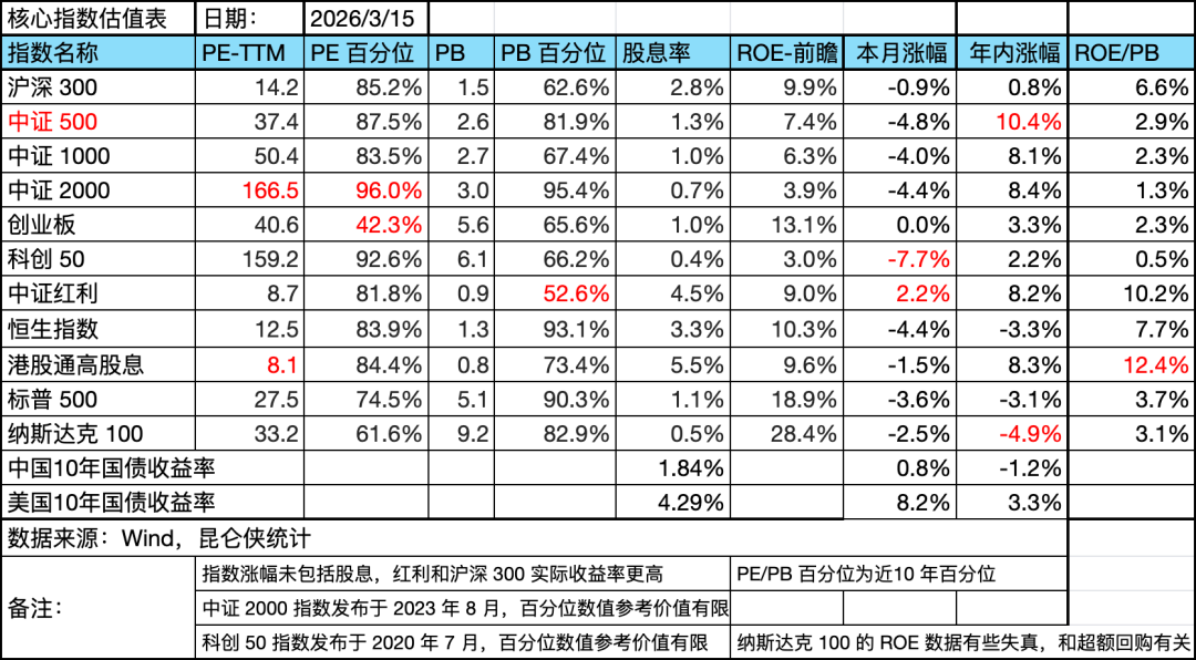 3月份上半月全球资本市场都在为中东战事出军费,主流宽基里除了中证红利指数逆势上涨 2.2%外,其余各大指数都出现不同程度的下跌,科技板块中的科创50跌幅最大,下跌 7.7%。